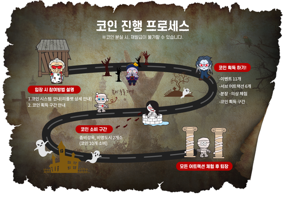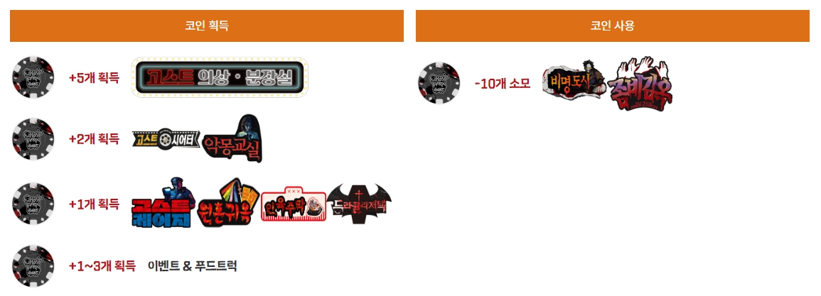 - 악몽교실, 고스트케이지, 원혼귀옥, 고스트씨어터, 인육주막, 드라큘라 저택