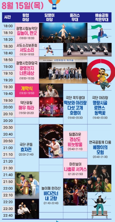 - 서커스, 춤, 마술, 마임 등 다양한 장르의 공연