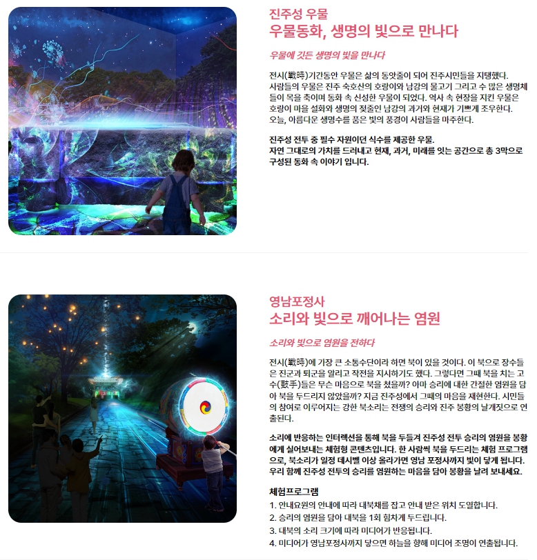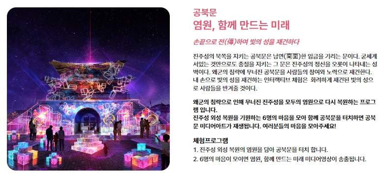 : 전통 한복 의상 체험을 비롯해 소원을 들어주는 빛 주머니 걸기 체험, 디폼 블록으로 함께 진주성 외벽 복원을 염원하는 진주성 만드는 체험 등 다양한 체험 프로그램