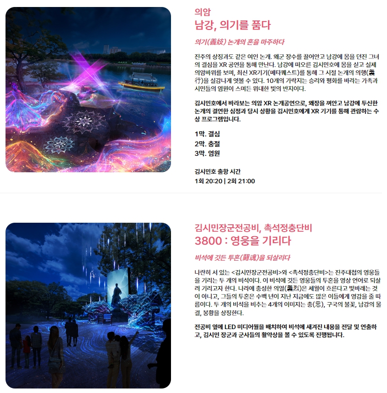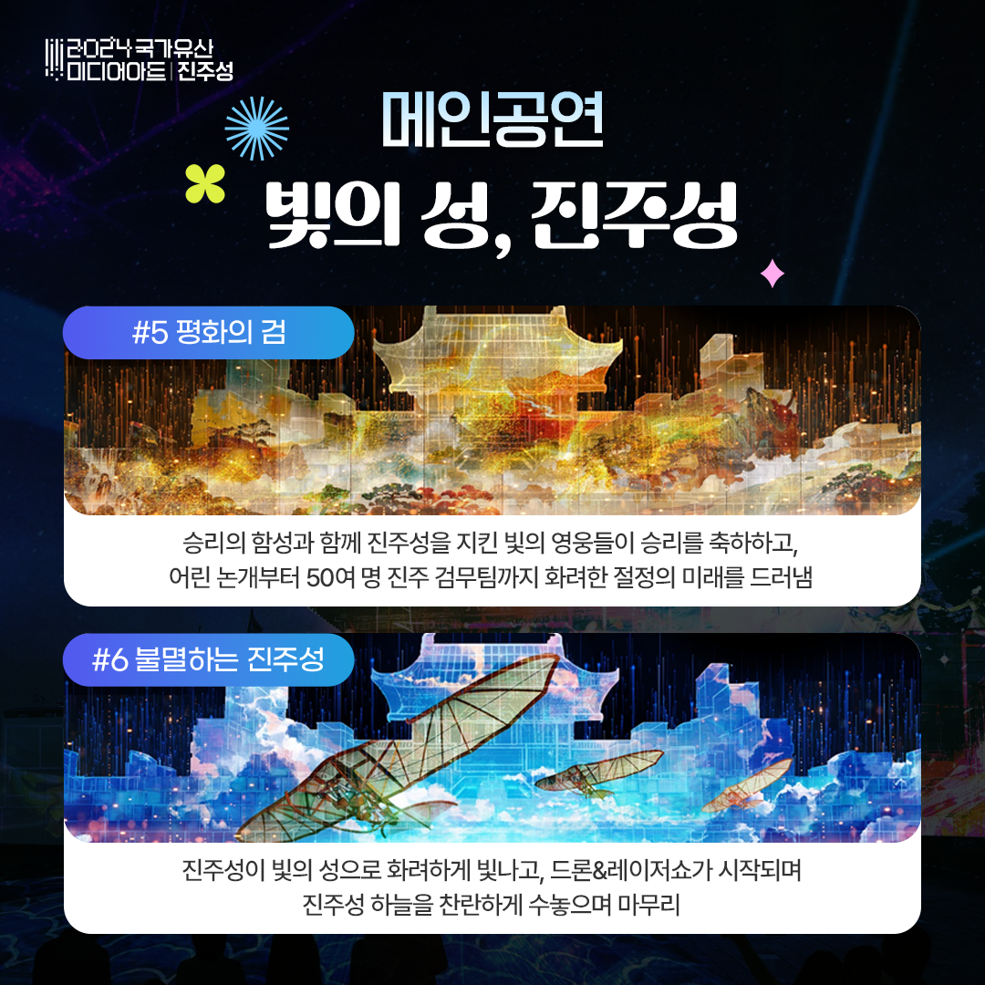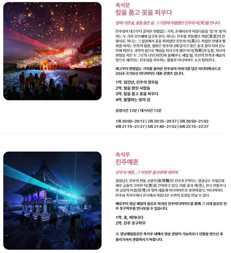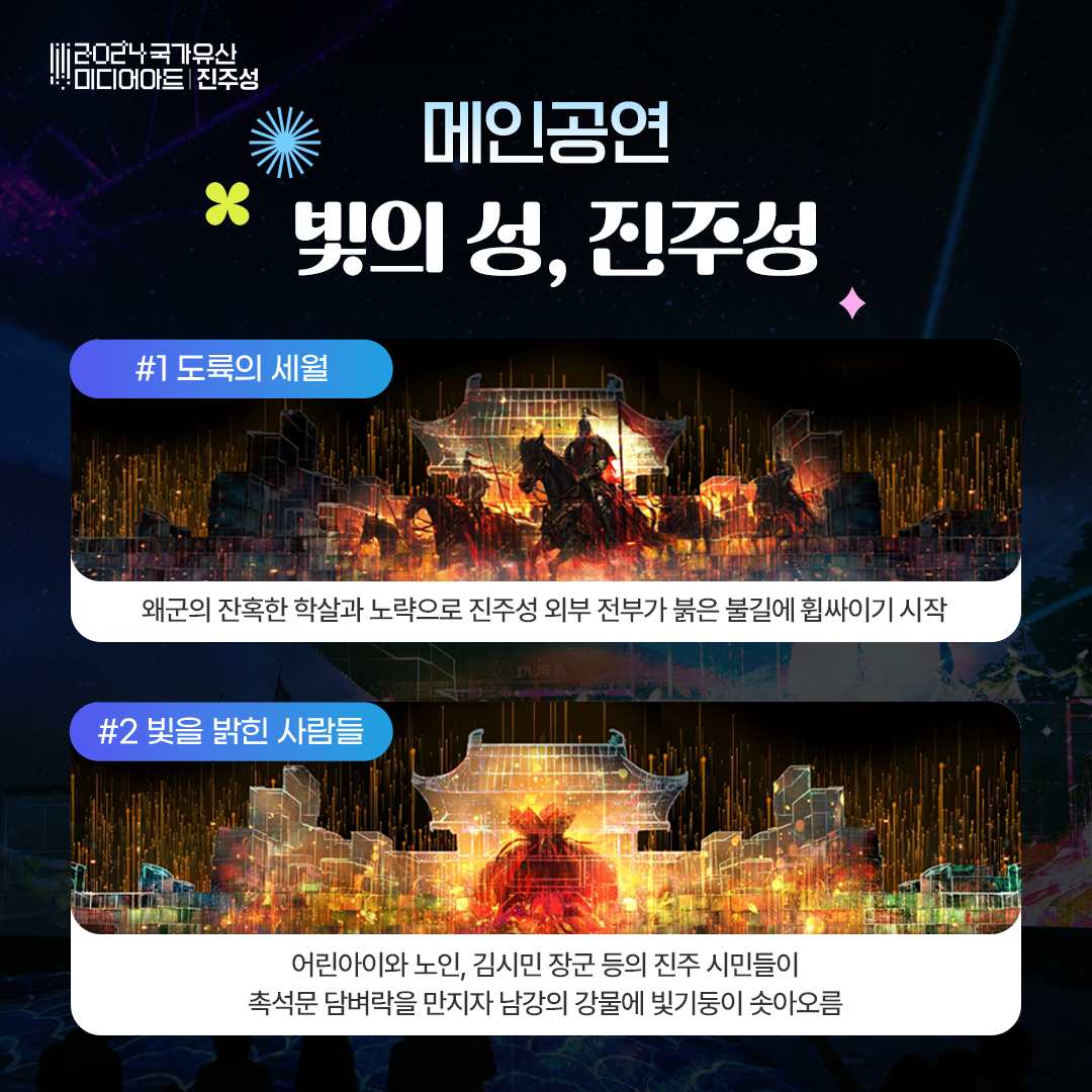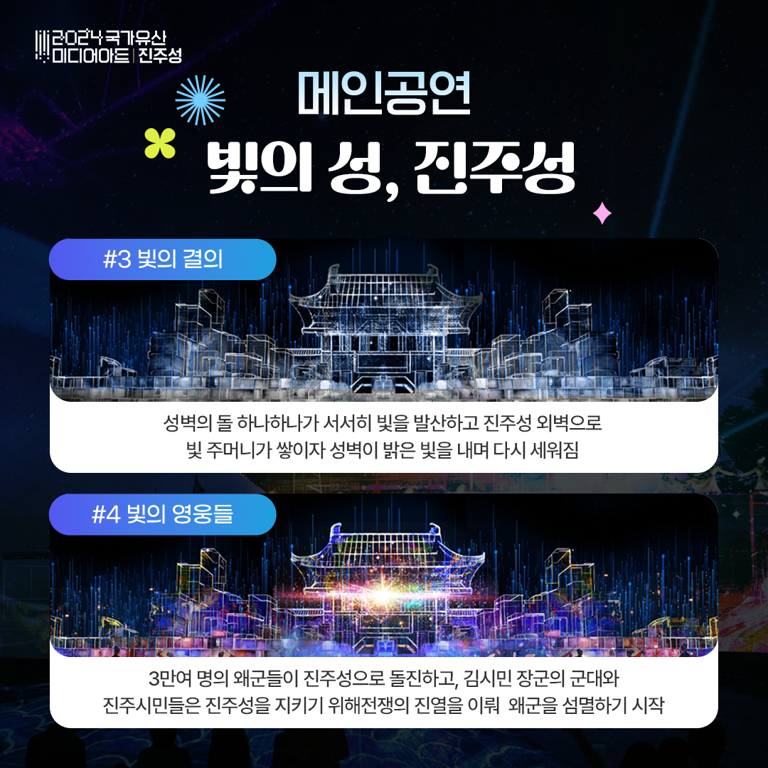 : 불굴 충절의 정신이 드러나는 진주성 전투와 진주성의 희망찬 미래를 표현한 촉석문 미디어파사드 (총 4막으로 구성)
