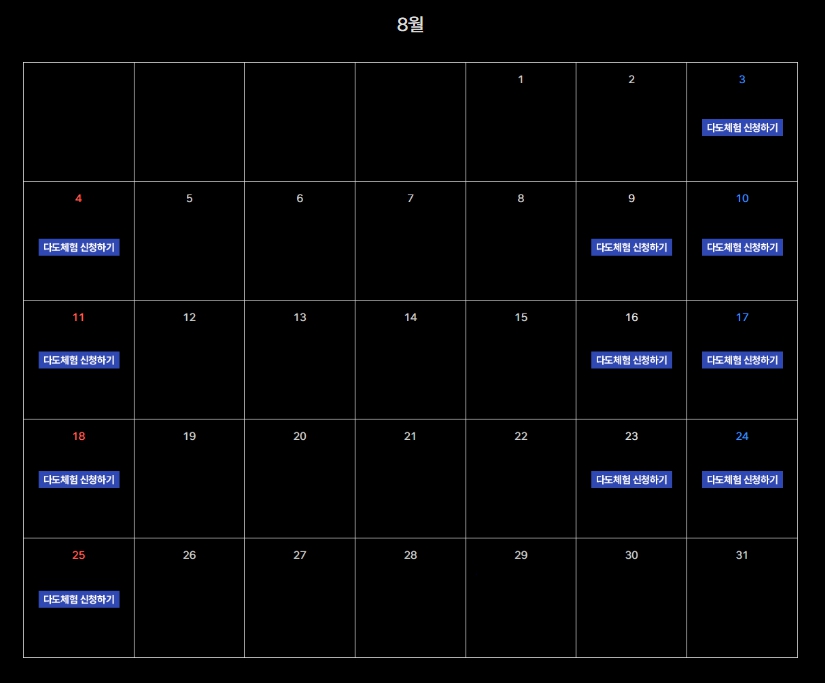 | 일 | 월 | 화 | 수 | 목 | 금 | 토 |