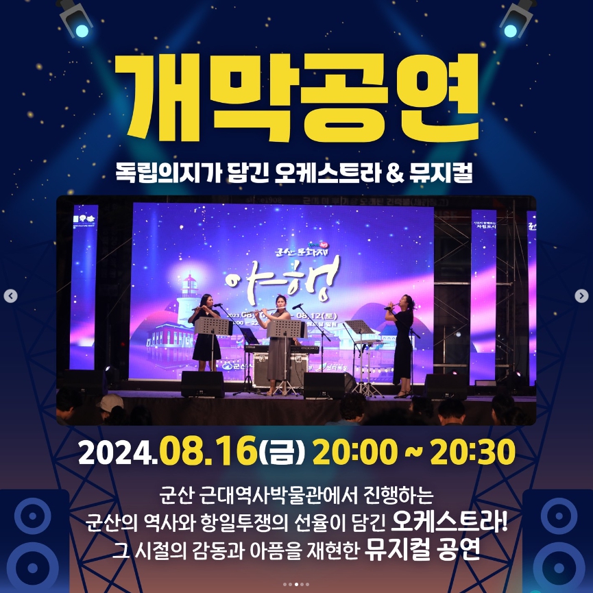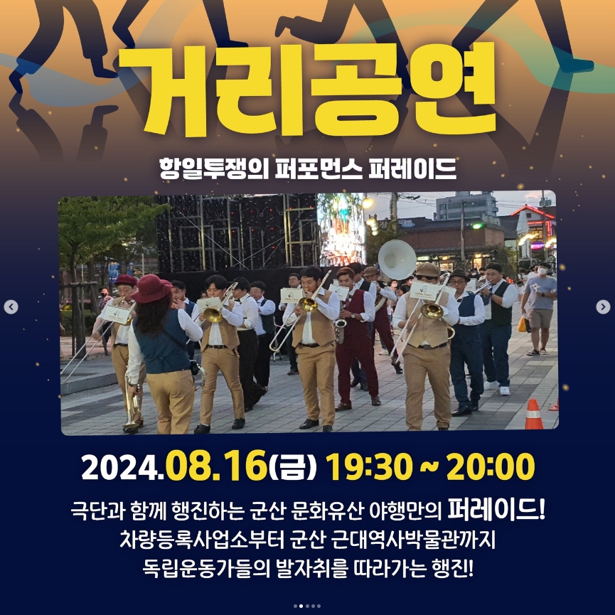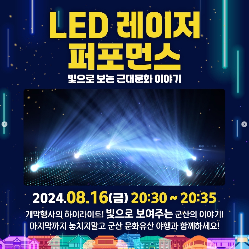 군산문화유산야행은 2024.08.16. (금) ~ 2024.08.17. (토) / 2024.08.23. (금) ~ 2024.08.24. (토) 총 4일간 진행한다. 군산 문화유산 밀집구역인 군산 내항 역사 문화공간 및 원도심 일원에서 야간에 문화유산을 향유하는 야간형 행사이다. 지붕 없는 박물관이라는 별명답게 원도심 일원에서 여러 문화유산들과 함께 하는 다양한 프로그램으로 볼거리와 체험거리를 동시에 챙길 수 있는 행사이다. 한 여름밤 군산의 문화유산을 가족, 친구, 연인들과 함께 공부하며 알아가고 다양한 먹거리와 즐길 거리를 통해 더욱 뜻깊은 순간을 가질 수 있는 군산의 야간형 문화예술축제이다.