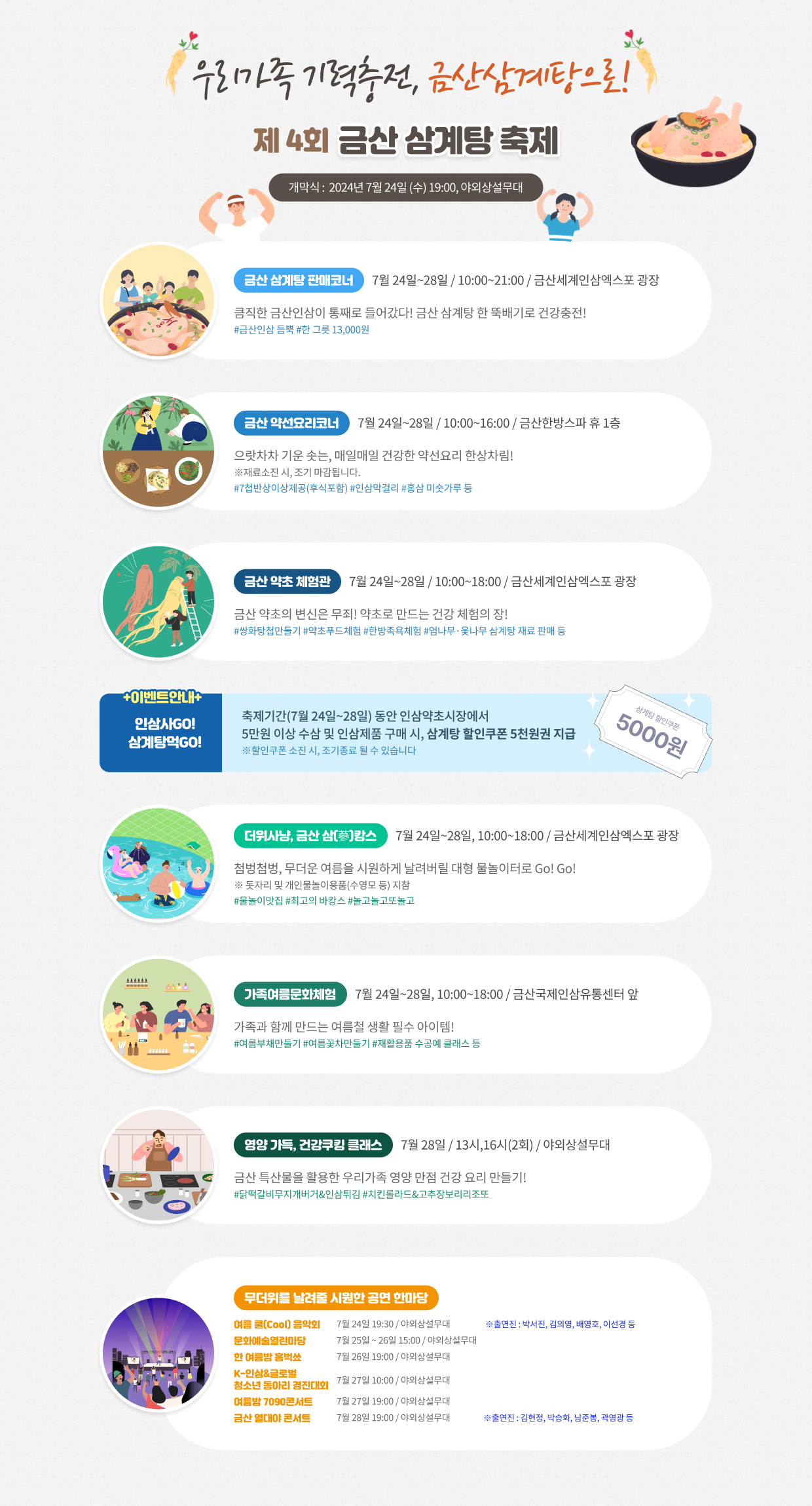 여름철 보양대표음식으로 손꼽히는 삼계탕에 여름 ‘물’체험과 건강 ‘약초’체험이 어우러진 전국 최초의 삼계탕 축제로서 금산에서만 맛볼 수 있는 인삼·약초 삼계탕 한 그릇과 다채로운 여름 건강문화체험으로 가족의 건강도 챙기면서 색다른 즐거움을 만끽할 수 있는 금산 여름 대표 축제이다.