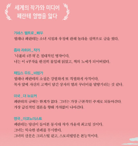 저자 엘레나 페란테Elena Ferrante는 이탈리아 나폴리에서 출생한 작가로, 나폴리를 떠나 고전 문학을 전공하고 오랜 세월을 외국에서 보냈다는 사실 외에 알려진 바가 없다. ‘엘레나 페란테’라는 이름조차도 필명이다. 작품만이 작가를 보여준다고 주장하는 페란테는 어떤 미디어에도 모습을 드러내지 않고 서면으로만 인터뷰를 허락한다. 이탈리아에서는 여전히 작가의 정체와 관련된 여러 가지 소문이 떠돌지만 아직도 베일에 싸여 있다. 1992년 첫 작품 『성가신 사랑』을 출간해 이탈리아 평단을 놀라게 한 페란테는 2002년 『홀로서기』를 출간한다. 에세이집 『라 프란투말리아』(2003)와 소설 『어둠의 딸』(2006), 『밤의 바다』(2007)를 출간한 뒤 2011년 ‘페란테 열병’(#FerranteFever)을 일으킨 ‘나폴리 4부작’ 제1권 『나의 눈부신 친구』를 출간한다. 이어서 『새로운 이름의 이야기』 『떠나간 자와 머무른 자』 『잃어버린 아이 이야기』까지 총 네 권을 출간해 세계의 베스트셀러 작가가 된다.