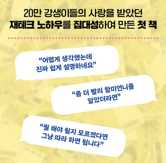이 책은 총 4부로 동기부여, 재테크, 마인드셋, 성장루틴으로 구성되어 있으며, 돈이 저절로 모이는 재테크 3단계부터 ETF, 미국 주식까지 그야말로 재테크 노하우를 꾹꾹 눌러 담았다. 꾸준하게 돈을 모으고 불리는 습관을 유지하는 힘과 자기 관리법 등도 함께 전한다. 이 책을 통해 재테크에 한 걸음 더 다가가 인생의 불안을 없애는 경험을 얻어가길 바란다.
