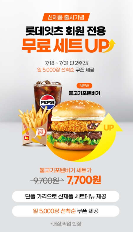 롯데잇츠회원 전용 일 선착순 5,000장 한정 쿠폰제공하여 무료 세트 UP 이벤트를 7월18일 ~7월31 까지 진행한다.
