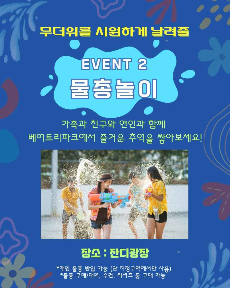 베어트리파크에서는 7월 6일(토)부터 8월 25일(일)까지 (주말 및 공휴일) 썸머 페스티벌이 열린다. 이벤트로는 야광놀이와 물총놀이가 있다. 블랙라이트 룸에서 즐기는 야광놀이는 다양한 포토존과 게임, 바디 페인팅 등을 즐길 수 있으며, 물총놀이는 넓은 잔디광장에서 시원하게 즐길 수 있도록 물총으로 할 수 있는 여러 프로그램이 진행된다.