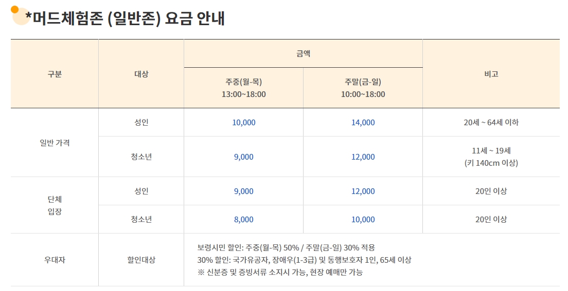 - 체험존 운영시간은 (주중(월-목)) 13:00 ~ 18:00 / (주말(금-일)) 10:00 ~ 18:00 까지 운영하며 주말(금-일)의 경우 13:30 ~ 14:30 까지는 체험시설 정비 시간으로 들어가실 수 없으니 참고해 주시기 바랍니다.