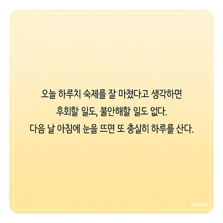 다만 나는 일상에 숨어 있는 행복을 최대치로 찾아 누리라는 말을 하고 싶은 것이다. 어차피 내일도 출근길 교통지옥에 시달릴 것이고, 과중한 업무량에 상사와 갈등할 것이며, 아이를 돌보느라 진을 빼고, 스마트폰을 손에 쥐고 잠들 것이다. 삶의 방향을 획기적으로 바꾸지 않을 거라면 결국은 피할 수 없는 하루다. 그렇다면 기왕이면 즐겁게 보내려고 노력해 보는 건 어떨까. 출근길에 마주치는 사람들을 관찰하며 새로움을 발견할 수도 있고, 상사에게 커피 한 잔을 권하며 부드러운 아침을 맞이할 수도 있다. 아이와 함께 요리와 설거지를 할 수도 있다. 어차피 할 일이라면 최대한 즐겁게 해 버리는 것. 그것이야말로 반복되는 일상을 즐겁게 버티는 비결이자 추억거리를 많이 만드는 방법이다.