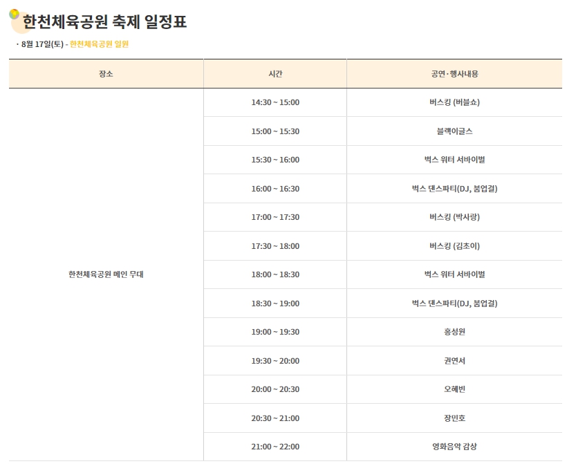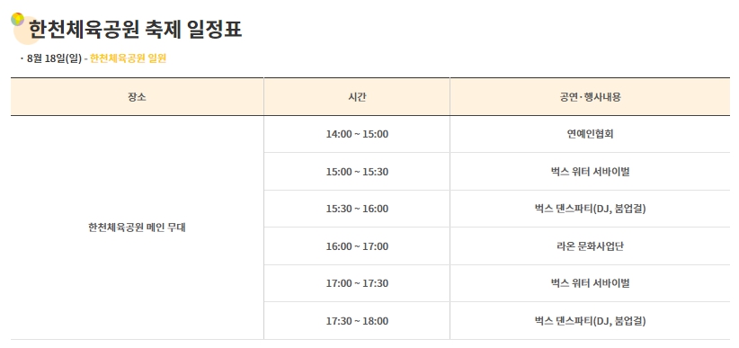 2. 공연프로그램 : 벅스 댄스파티, 벅스 워터서바이벌, 버스킹공연, 블랙이글스, 축하공연 등