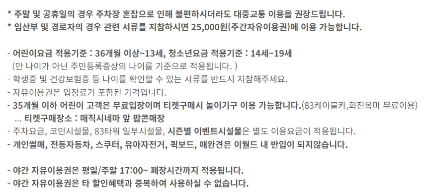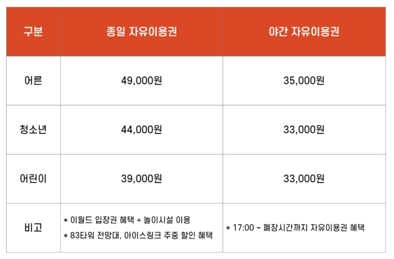 - 대인: 49,000원 / 청소년: 44,000원 / 어린이: 39,000원