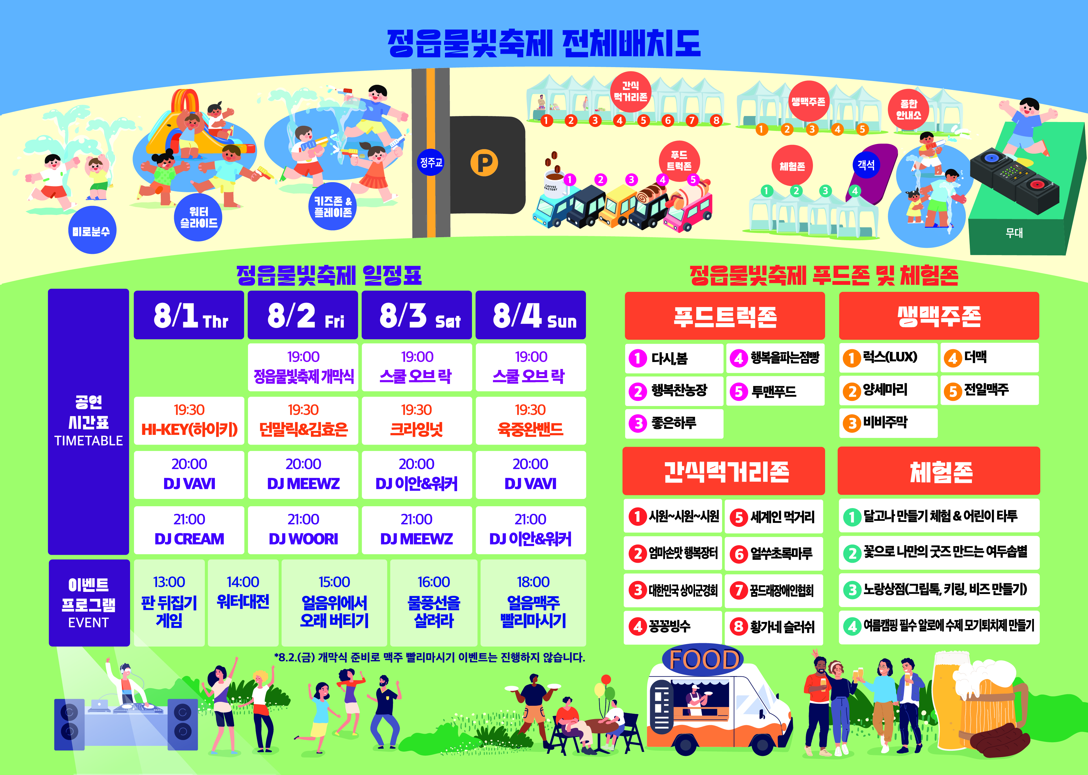 1. 메인프로그램 : 뮤직페스티벌(하이키(8/1), 던말릭&김효은(8/2), 크라잉넛(8/3), 육중완밴드(8/4)), EDM party(8. 1. ~ 8. 4.)