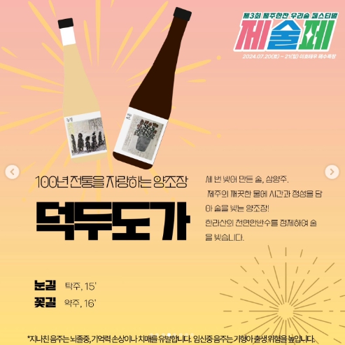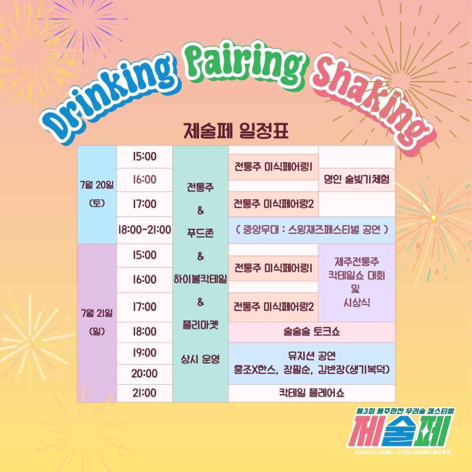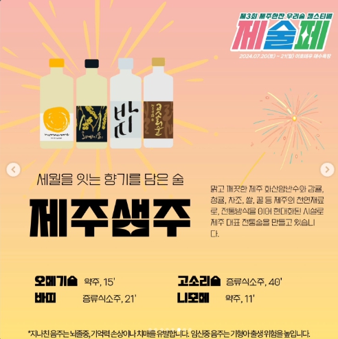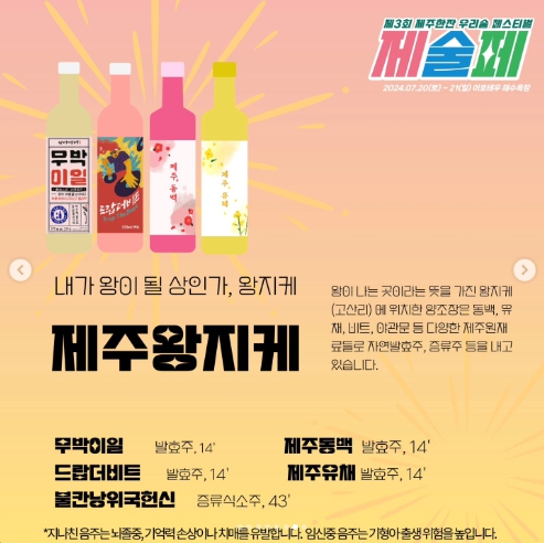 - 제주 전통주 zone: 40가지에 이르는 제주 전통주를 한 자리에서 구매하여 즐기실 수 있습니다. 현장에서 주류 티켓 구매시 시음이 제공됩니다.
