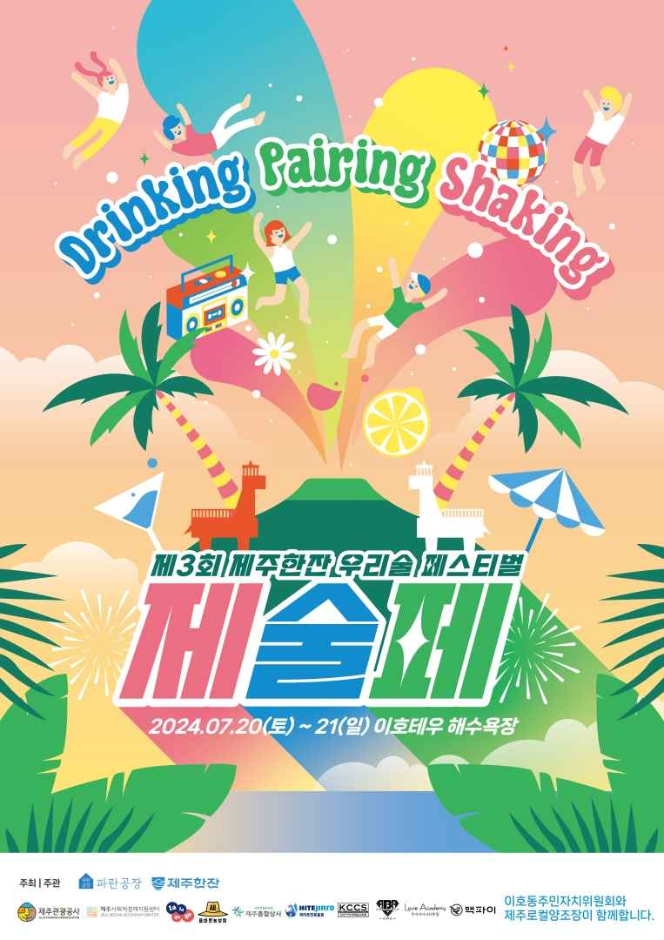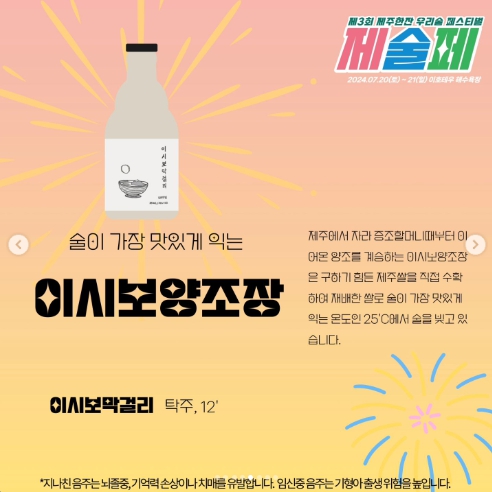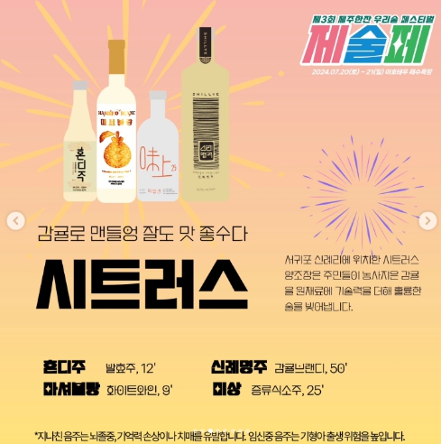 제3회 제술페는 스페셜 에디션인 감귤 증류식소주 [이호테우 한잔]을 비롯해,40가지에 이르는 제주의 다양한 로컬 막걸리, 약주/발효주/증류식 소주, 칵테일, 하이볼 등이 준비됩니다.