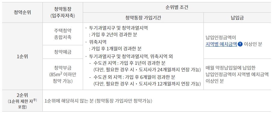 - 투기과열지구 또는 청약과열지역 내 국민주택에 청약하는 경우 청약통장이 1순위에 해당하여도 2순위로 청약하여야 합니다.