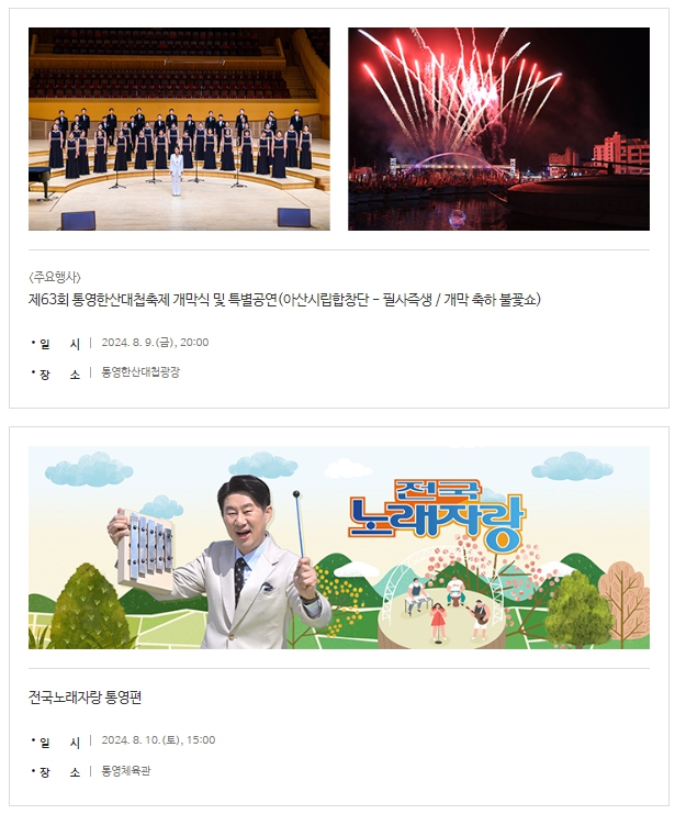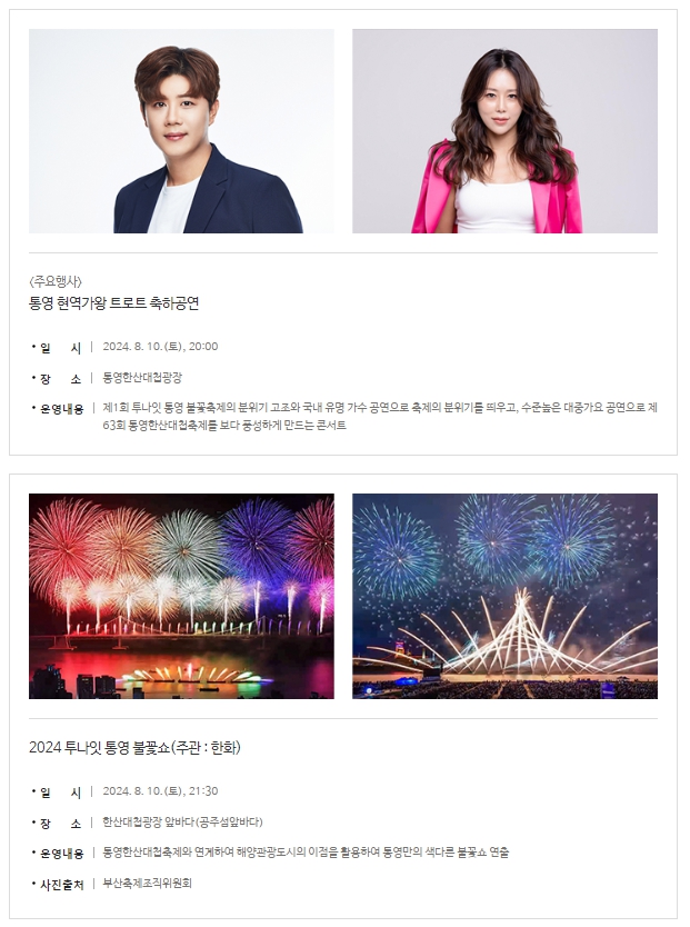 | 21:30~21:50 | 2024 투나잇 통영 불꽃쇼(주관 : 한화) | 통영한산대첩광장 앞바다 | |