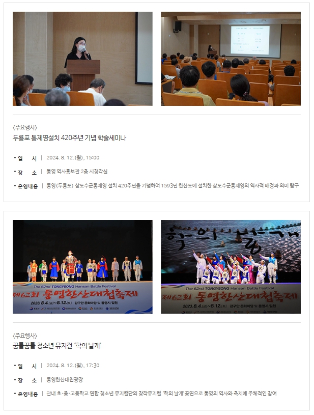 15:00~17:00 두룡포 통제영 설치 420주년 기념 학술세미나 역사홍보관(통제영거리)
