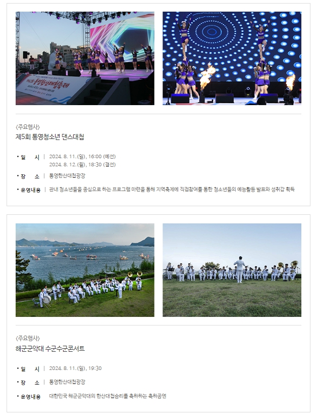 4. 기타 내용 : MADE IN 통영 12공방, 이순신장군 해전 승리 및 병영 체험마당, 삼도수군통제영 무과 체험, 임진왜란 3대 대첩 도시 캐릭터 등 전시, 승전의 북소리, 조선수군 시량체험, 통영 전통연 야간 조명 전시, 한산대첩 주전부리 존, 뮤지시스 버스킹 공연, 찾아가는 통영한산대첩축제