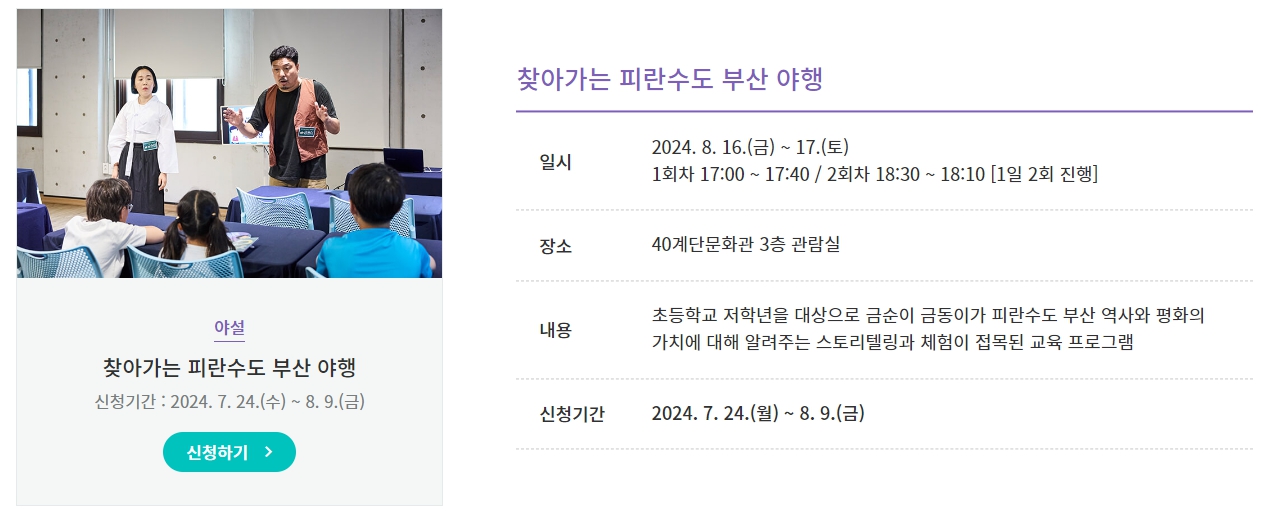 2024 피란수도 문화유산 야행은 '피란, 그 시절의 이바구'라는 슬로건으로 8월16일(금) ~ 8월17일(토) 2일간 부산근현대역사관, 부산기상관측소, 40계단문화관 등에서 진행되며, 평화와 역사의 이바구가 흐르는 피란수도 부산 문화유산을 즐기는 야간 축제이다. 8개의 프로그램(야경, 야로, 야설, 야사, 야화, 야시, 야식, 야숙)이 준비되어 있으며, 총 22개의 프로그램으로 구성되어 있다. 피란 시절을 재현한 컨셉 부스와 프로그램 등을 통해 그 시절을 경험해 볼 수 있으며, 그 시절 삶 속 인물들을 만나며 미션을 통해 문화를 체험할 수 있는 특색있는 콘텐츠로 준비되어 있다.