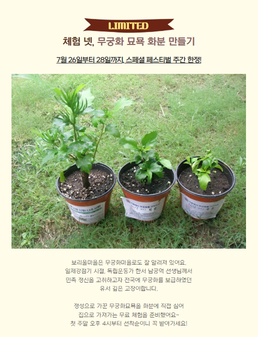 - 무료행사 : 무궁화 묘목 화문 만들기 / 보리강정 만들기