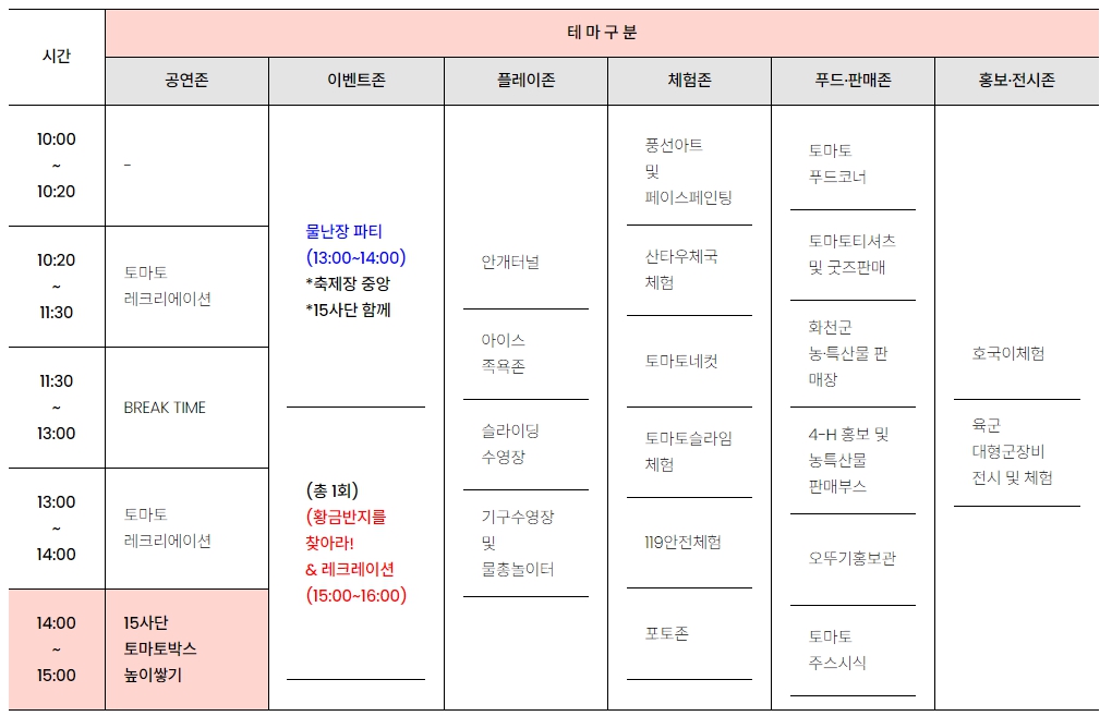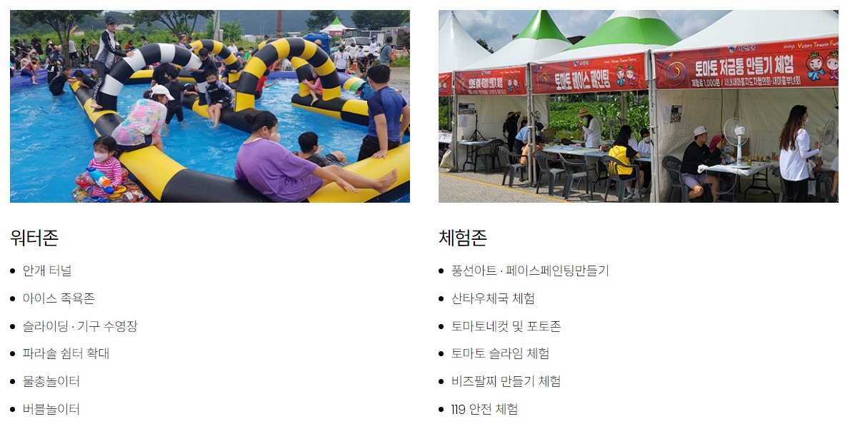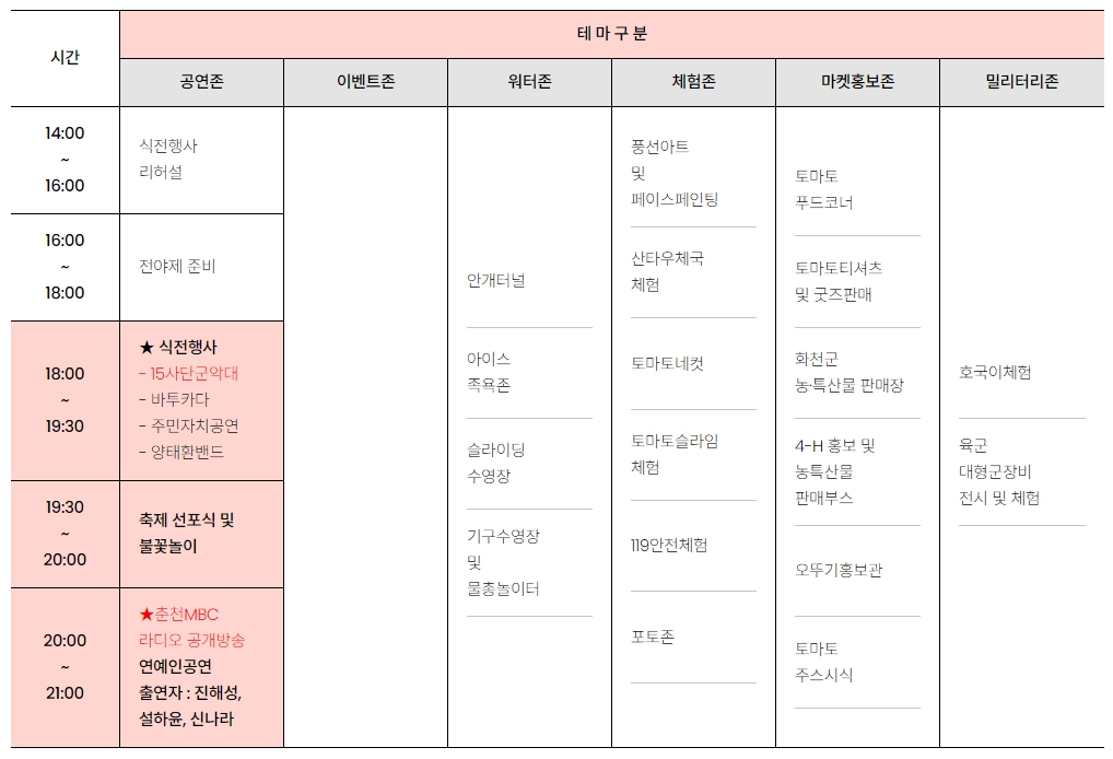 토마토를 주제로 한 체험·전시·공연 프로그램 및 화천토마토 등 농특산물 판매를 하는 다채로운 체험이 있는 행사이다. 약 30여개의 화천 토마토를 주제로 한 특색있는 프로그램을 운영하고 있으며 대표적인 프로그램으로는 토마토 속에서 금반지를 찾는 "황금반지를 찾아라", 1000명의 토마토 음식을 만들어 시식할 수 있는 "천인의식탁", 폭염에 대비한 시원한 물놀이장 운영, 무더위쉼터, 아이스족욕존 체험이 있다. 무대 공연으로는 전야제의 축제선포식 및 연예인 공연, 불꽃놀이 행사, 승리부대 장병의 밤 공연, 물난장파티 및 깜짝이벤트 공연이 준비되어 있어 남녀노소 누구나 다함께 즐길 수 있는 여름축제이다.