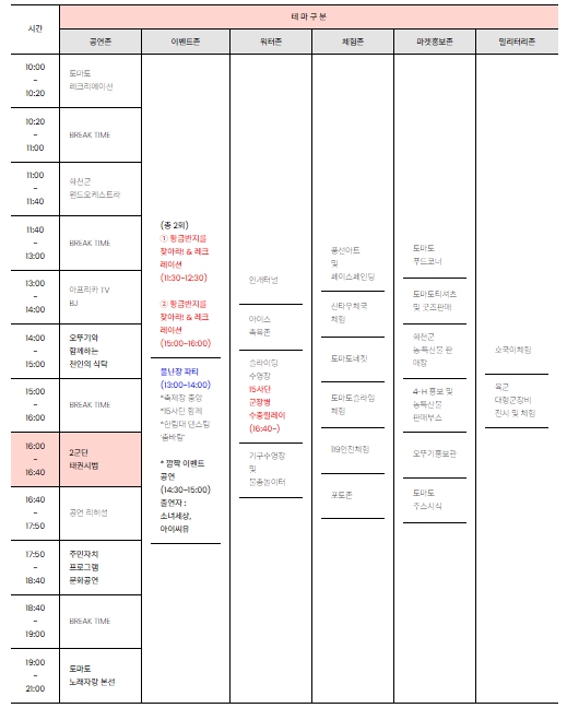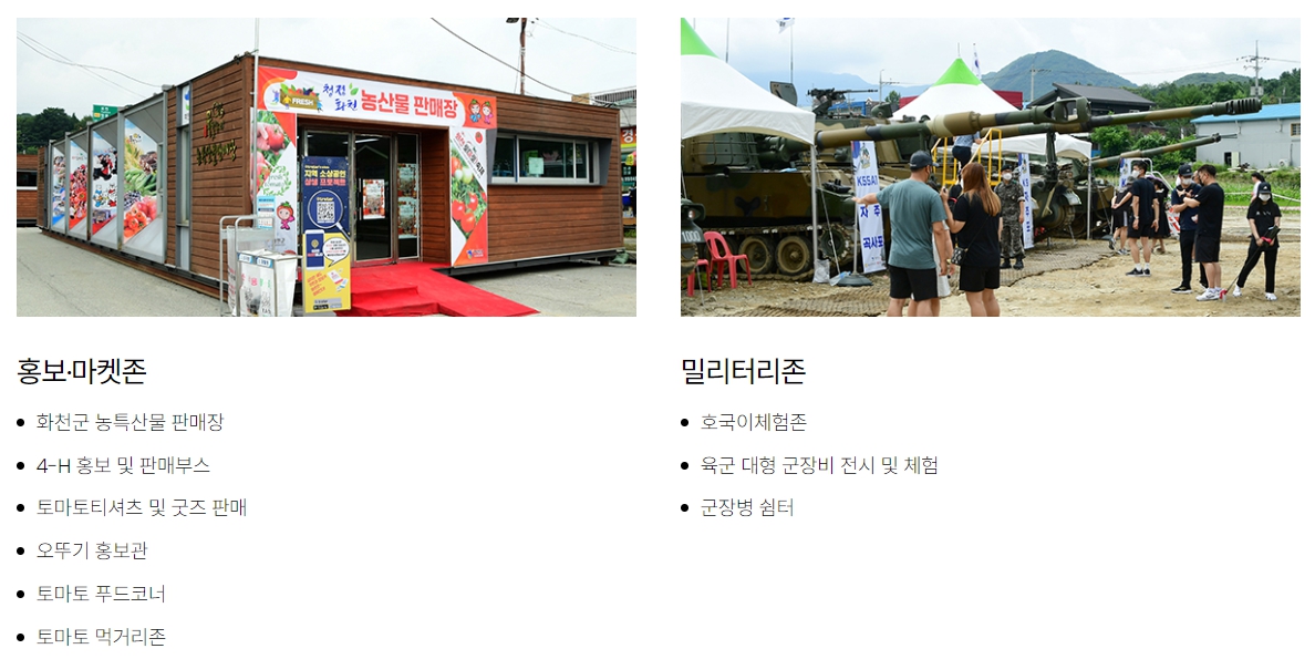 마켓홍보존 : 푸드코너, 먹거리존,4-H홍보관,농특산물판매장,오뚜기홍보관,티셔츠및 굿즈판매