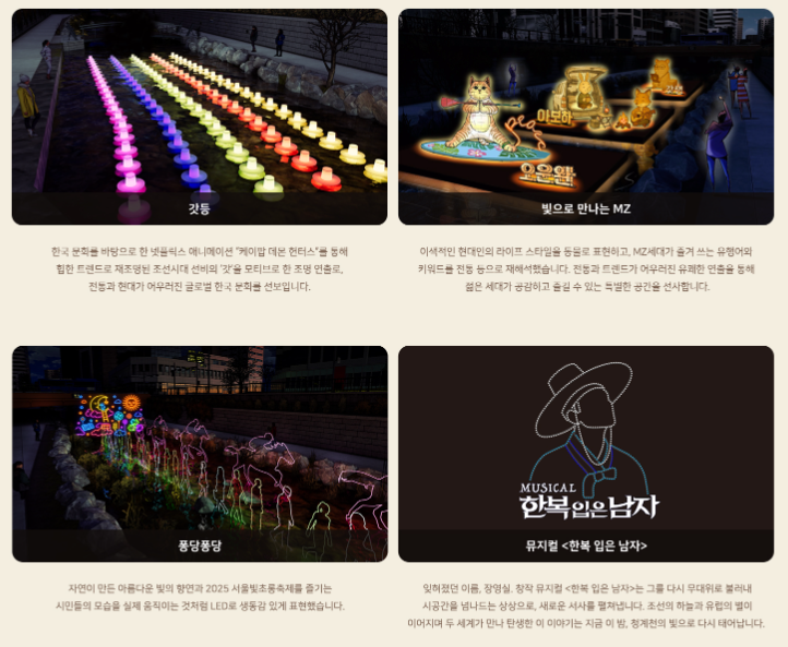 특히, 이번 2025 서울빛초롱축제는 “나의 빛, 우리의 꿈, 서울의 마법"을 주제로 청계천 및 우이천 일대에서 개최됩니다.