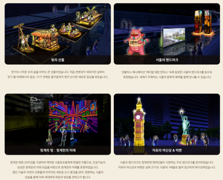 🚶♀️ 최적의 관람 코스 & 시간: 여유롭게 빛의 향연을 만끽하세요! 청계천 구간은 청계광장에서 삼일교로 이어지는 약 1km 정도의 코스가 정석인데요, 이 코스를 따라 각기 다른 테마의 빛 조형물들을 만날 수 있어요. 특히 광화문 쪽으로 가시면 광화문 마켓이 함께 열리니, 을지로 또는 종각역에서 광화문 쪽으로 관람하시는 것을 추천해 드려요. 그리고 무엇보다 빛 조형물은 해가 진 저녁부터 가장 아름답기 때문에, 오후 6시 개장 시간에 맞춰 방문하시거나, 폐장 직전인 밤 9시 이후에 방문하시면 비교적 여유롭게 관람하실 수 있을 거예요.