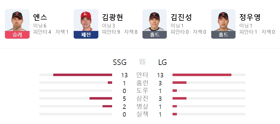 | 홈런 | 오지환3호(3회4점 김광현),김범석6호(3회1점 김광현),문보경13호(4회2점 김택형),에레디아10호(7회4점 최동환) |