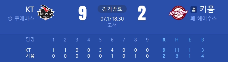 [24.07.17 (수) 고척 18:30 / KT 9 : 2 키움]