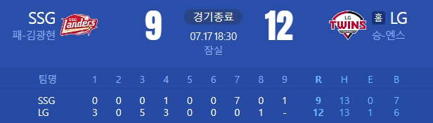 [24.07.17 (수) 잠실 18:30 / SSG 9 : 12 LG]