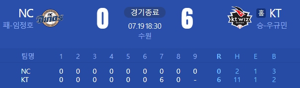 [24.07.19 (금) 수원 18:30 / NC 0 : 6 KT]