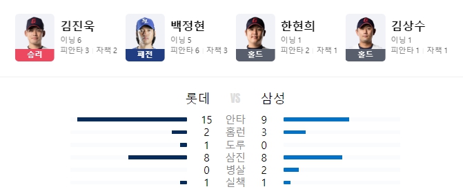 | 홈런 | 구자욱20호(6회2점 김진욱),이성규16호(7회1점 김강현),강민호9호(8회1점 김상수), 레이예스10호(9회2점 오승환),정훈8호(9회1점 김대우) |