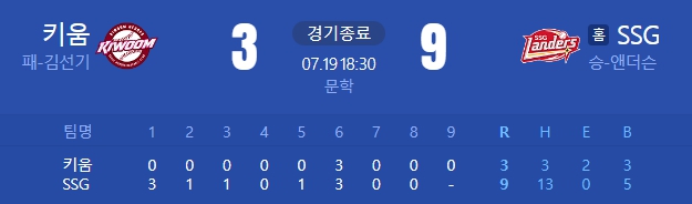 [24.07.19 (금) 문학 18:30 / 키움 3 : 9 SSG]