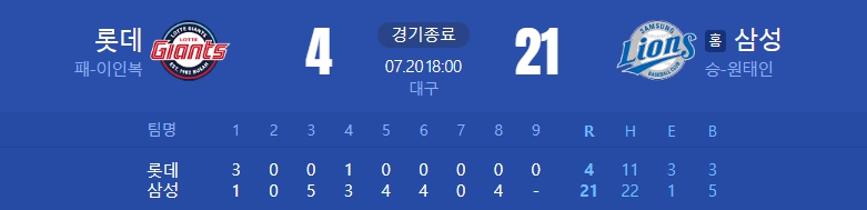 [24.07.20 (토) 대구 18:00 / 롯데 4 : 21 삼성]