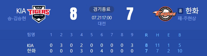 [24.07.21 (일) 대전 17:00 / KIA 8 : 7 한화]