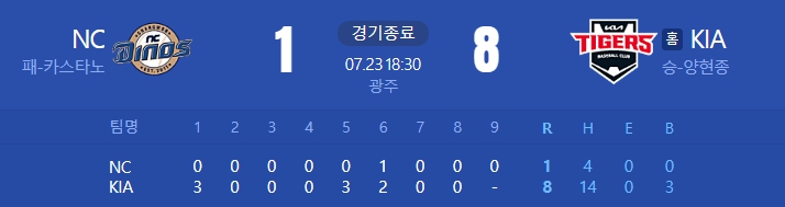 [24.07.23 (화) 광주 18:30 / NC 1 : 8 KIA]