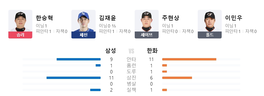 | 실책 | 노시환(8회),이병헌(8회),김재혁(8회) |