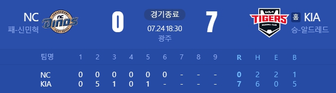 [24.07.24 (수) 광주 18:30 / NC 0 : 7 KIA]