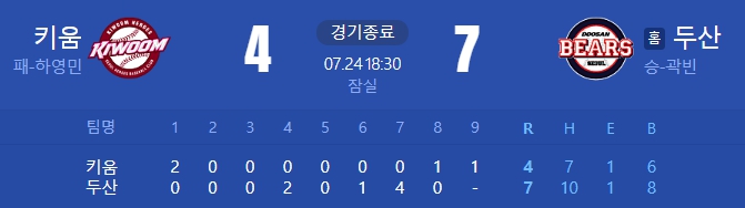 [24.07.24 (수) 잠실 18:30 / 키움 4 : 7 두산]