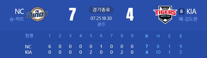[24.07.25 (목) 광주 18:30 / NC 7 : 4 KIA]