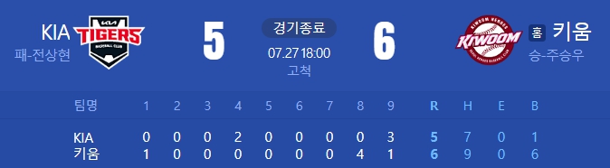 [24.07.27 (토) 고척 18:00 / KIA 5 : 6 키움]