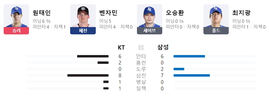 | 홈런 | 배정대6호(5회1점 원태인),장성우11호(9회1점 김재윤) |