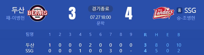 [24.07.27 (토) 문학 18:00 / 두산 3 : 4 SSG]