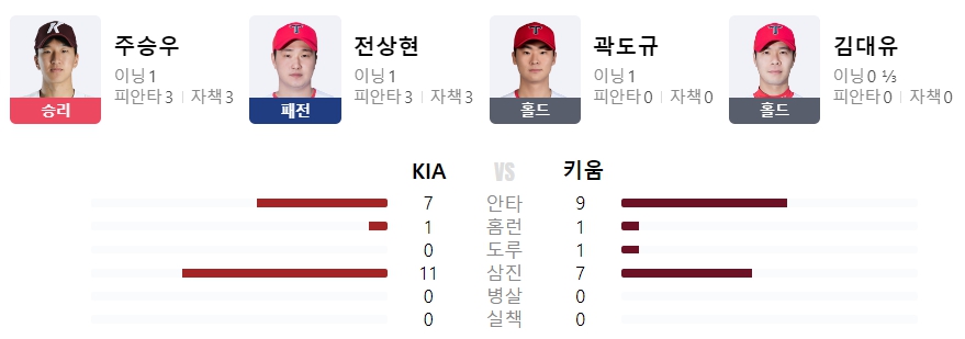 | 홈런 | 이주형9호(1회1점 황동하),김도영28호(4회2점 후라도) |