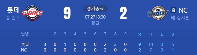 [24.07.27 (토) 창원 18:00 / 롯데 9 : 2 NC]