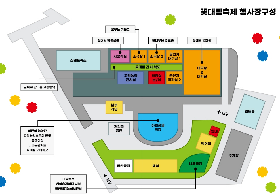 2. 부대프로그램 : <양반네 축제안내>, <망구네 업사이클 소고>, <참봉네 낭만초롱>, <각시네 트렌드 장화>, <동방치마네 똥빵한 만장>, <중광대네 소원성취>, <비리쇠네 악기공방>, <좌창우창네 나도참여마켓>, <대포수네 비건푸드>, <조리중네 주막>, <홍적삼네 카페>, <꽃대림본부식당>, <열세번째 잡색! 나도 굿깨비>