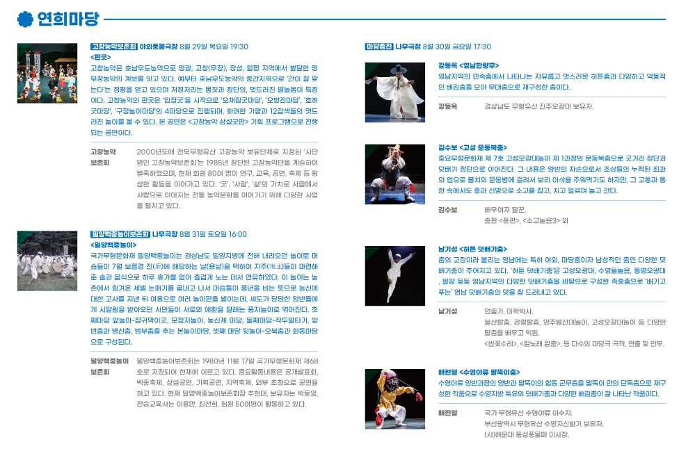 1. 메인프로그램 : 인문학마당 _ 학술굿판, 마을굿 이야기 / 특별마당_ 꽃대림 영화관, 꽃대림 전시 / 공연마당 <아이모멘트 - 쉼표>, <현대무용 워크숍>,<꿈꾸는 거문고>, <유희스카_니나노판서트> ,<들여다보고 안아주는 노래, 시와>/ 연희마당 <고창농악 판굿>, <밀양백중놀이>, <마당춤전>, <굿쟁이전>
