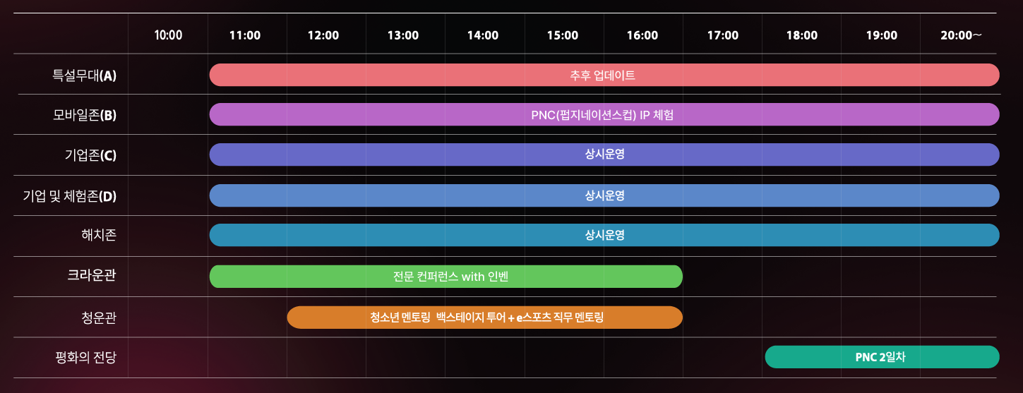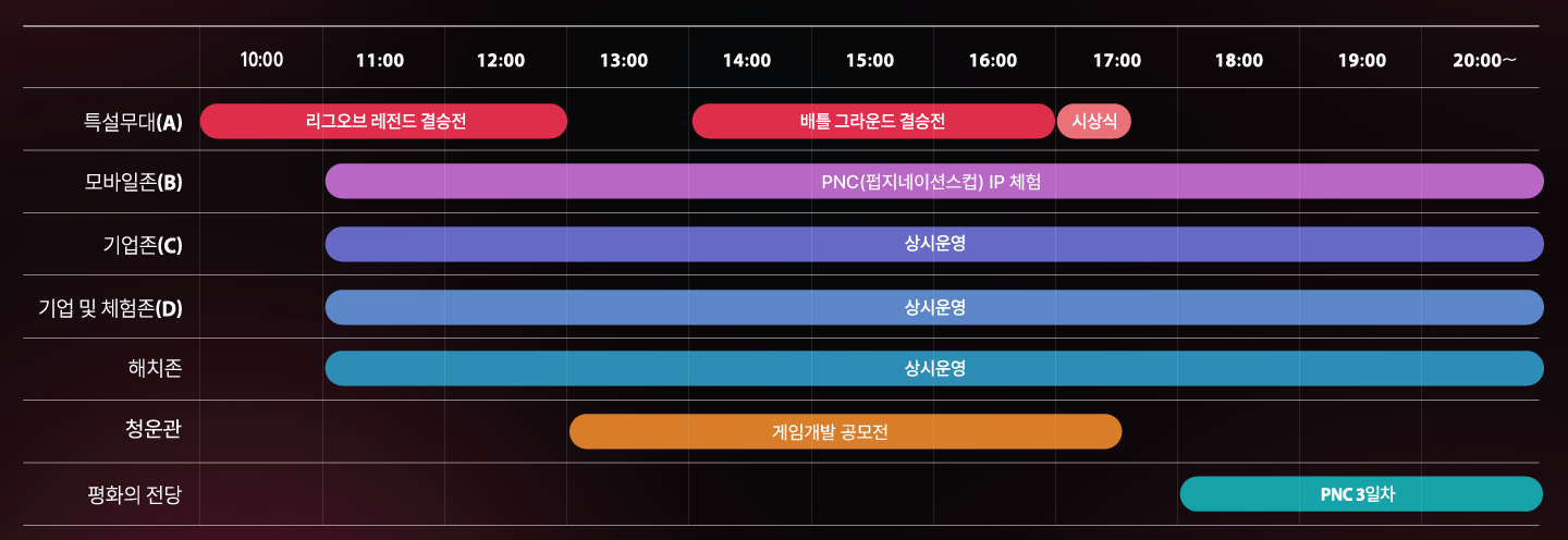 1. 메인프로그램 : 전국 청소년 e스포츠대회 서울컵, 인기크리에이터와 함께 배틀그라운드 나락전, DJ-MAX 게임음악 디제잉파티, 중소기업 게임전시