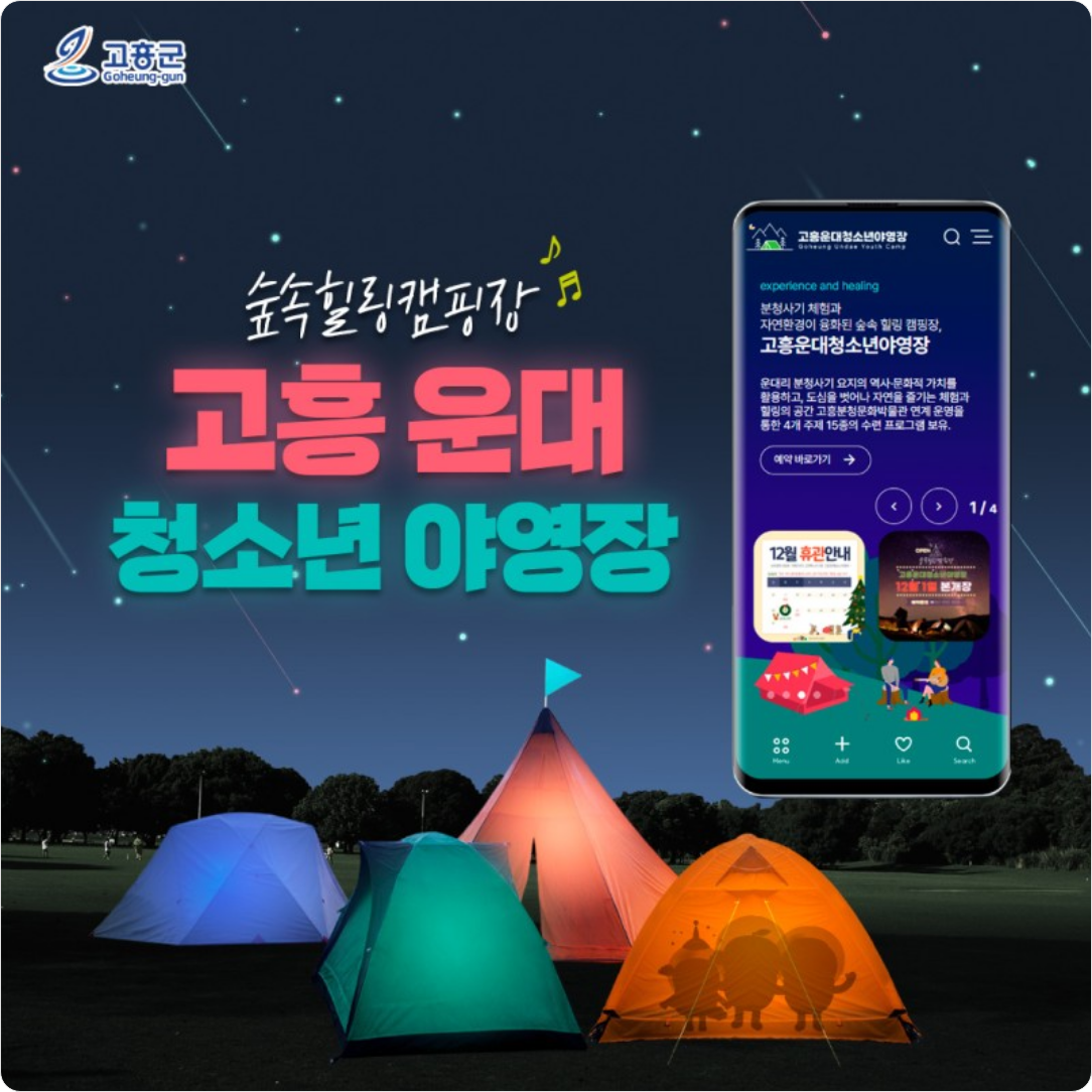 - 분청 캠핑: 고흥 분청사기 미디어아트(분청미디어아트.kr (http://xn--2z1br4k67a25p8pat84astk.kr/)), 고흥분청문화박물관(https://buncheong.goheung.go.kr/) 홈페이지에서 예약